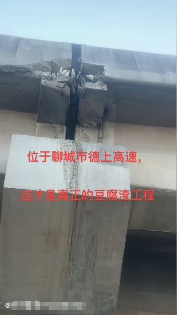 视频画面显示,高速公路桥梁伸缩缝处有缺损,内有白色条状填充物,并有男子的声音强调“这可是高速”。拍摄者反复放大缺损部位并拍摄了桥梁下两侧环境,画面上红色字体标注的“位于聊城市德上高速,这才是真正的豆腐渣工程”字样贯穿视频始终。目前,该视频已经下架。
