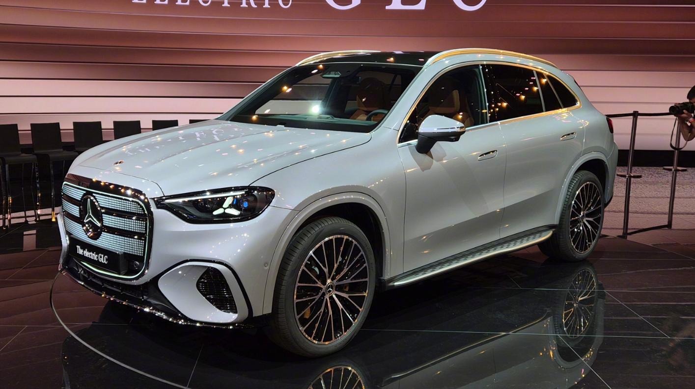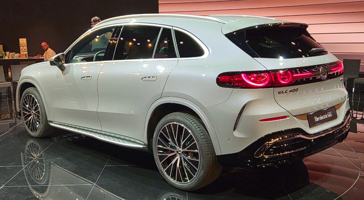 从侧面来看,这款奔驰GLC纯电已经采用了隐藏式电动门把手设计,搭配上漂亮的轮毂,车顶行李架,反光镜以及车窗四周的镀铬金属,看起来闪闪发光,颜值与精细感打造得都非常理想。车型尾部尾灯呈现出奔驰车标,叠加上奔驰本身的logo,尾部一共有5个奔驰标,所以奔驰也在刻画着高端形象,用奔驰车标打动用户。不得不说,整个外观的精致程度较足,而且电气化的程度非常足。