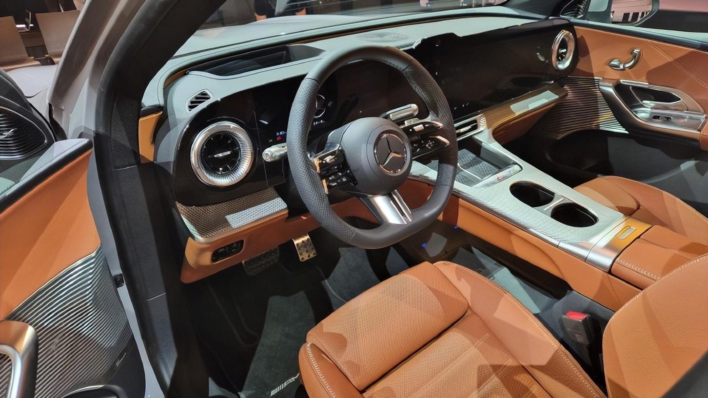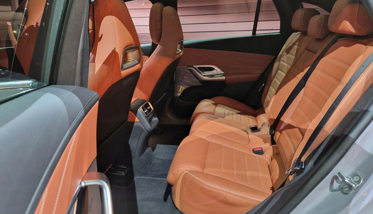 整个棕色的内饰布局充满了豪华感,搭配上大量的镀铬金属,细节感非常不错。尽管是一款纯电车型,但是第2排也有着比较高的地台凸起。为什么会出现这种现象呢?简单来说,就是这款奔驰GLC纯电与燃油版属于同款打造,所以牺牲了一部分的后排空间,但对国产车没有影响。