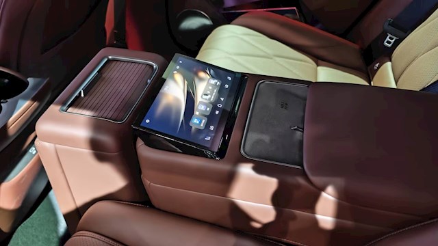 中控台部分配备了两个50W手机无线充电,还有64色可调氛围灯、27英寸W-HUD、14扬声器燕飞利仕音响、主动降噪等配置。