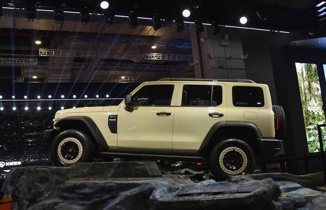 再来看车身侧面部分,车身侧面延续经典方盒轮廓,但每处细节都为越野场景量身定制。无漆处理的轮眉、外后视镜壳与车门拉手形成视觉统一,17 英寸防脱圈轮辋包裹固铂 Discoverer AT3 全地形轮胎(规格 265/70 R18),特殊胎纹设计可在泥沙中快速排泥,同时兼顾公路静音性。钢制侧踏板采用镂空设计,既方便驾乘者上下车,又能在岩石剐蹭时保护车身侧裙。车顶行李架支持 150kg 承重,配合可拆卸的侧帐预留接口,满足长途穿越的装备搭载需求。值得关注的是,车身轴距虽与普通版保持一致,但通过前移前桥优化了轴荷分布,使离地间隙提升至 260mm,涉水深度达到 900mm,远超同价位城市 SUV 的通过能力。